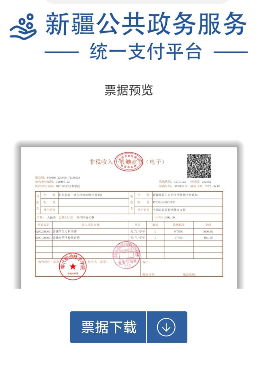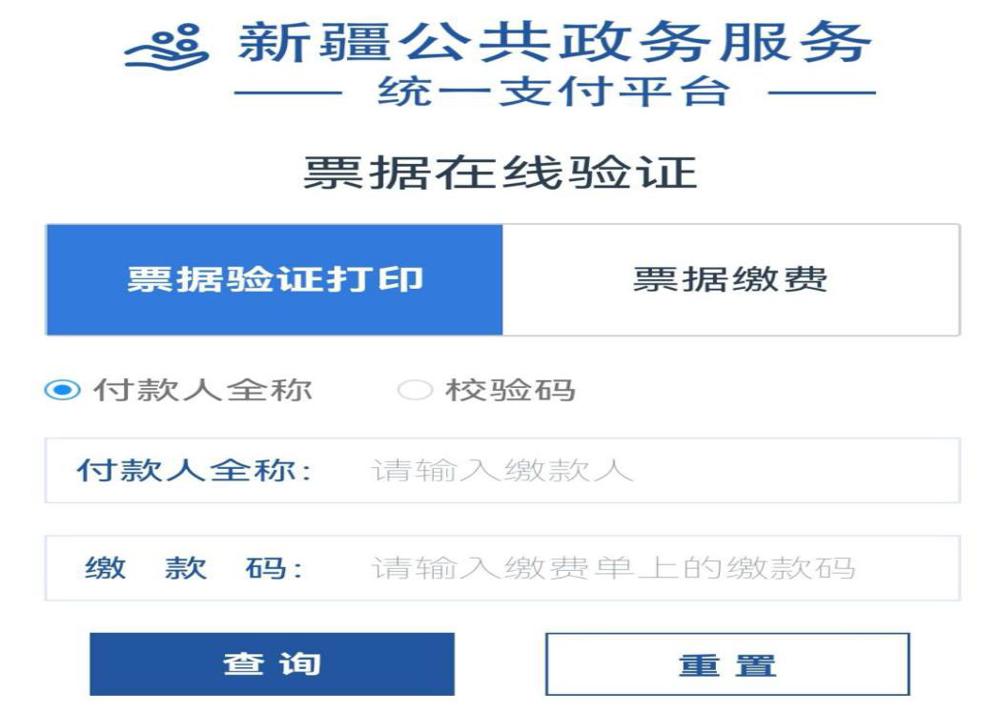 第四步: 缴费成功24小时后,在已连接打印机的电脑上,登陆电子缴款书查验网站:http://finpt.xjcz.gov.cn(此网站在缴款人收到的短信中也显示),输入第二步短信上的付款人全称和缴款码,方可下载保存、打印已缴费的电子票据,如下图(使用手机登录也可下载保存)。