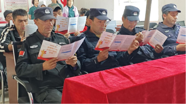 [图6:队员在叶城易地搬迁宣教馆为社区居民开展爱国主义主题宣讲]